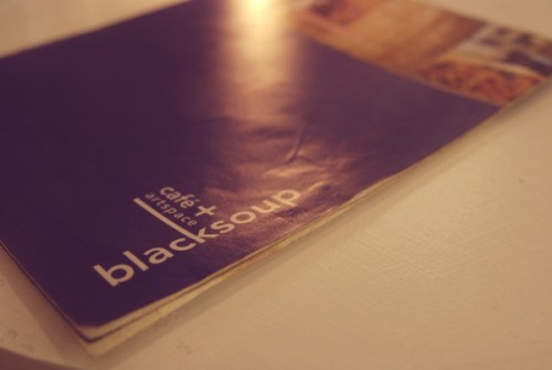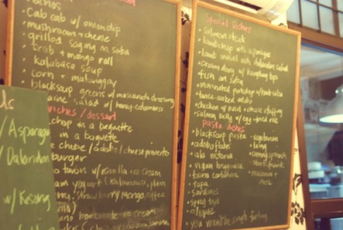 another trip to maginhawa st., quezon city, brought me and my friend to BLACKSOUP CAFE + ARTSPACE. it is a quaint little gem of a restaurant boasting of a wide array of yummy pasta dishes, most of which ooze with irresistible filipino flavor. the place looks amazing, too – filled with all sorts of quirky decor, like mismatched floral wallpaper, picture-laden tables, and a gorgeous wall clock with random postcards. definitely for the artsy fartsy in you!