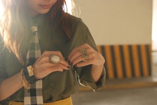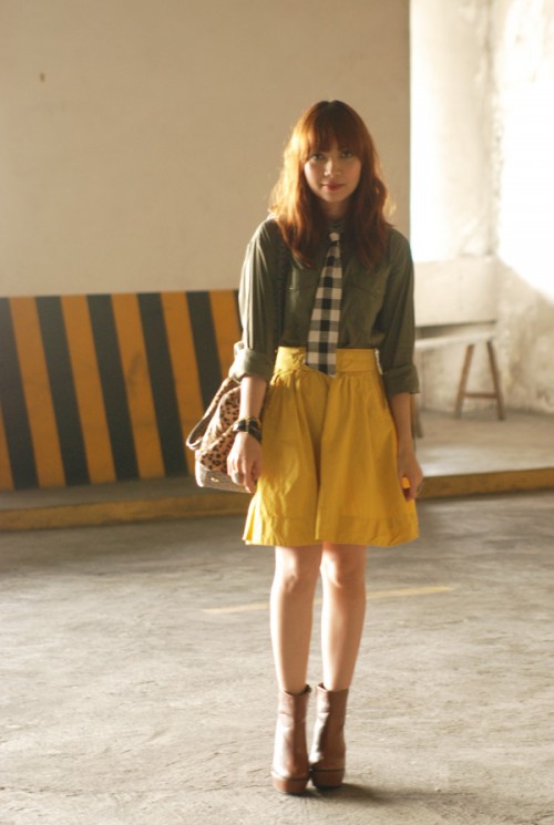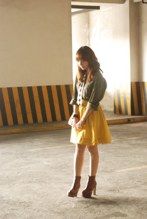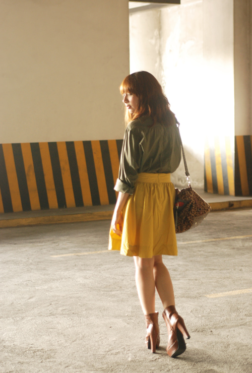 I’ve been obsessed with military green lately! I love it with mustard yellow and that tie! 🙂 The photo location here is really really really awesome! I’m gonna have to find an empty parking structure to do something similar!