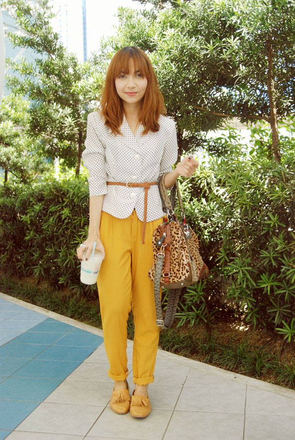 Ah I love your pants (mustard yellow is fast becoming one of my fav color) and how you belted your top. I also love how you paired it with that bag. A regular ‘ol person would probably just throw a plain black back with that outfit = boring.