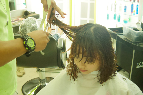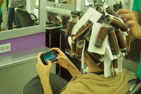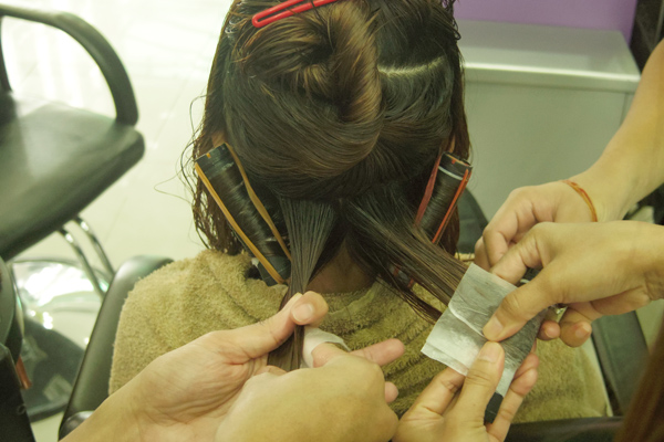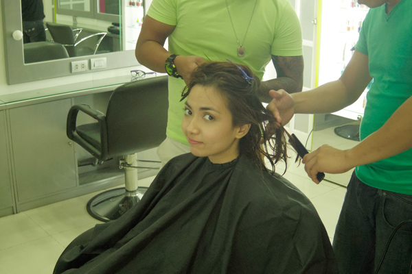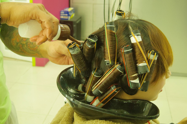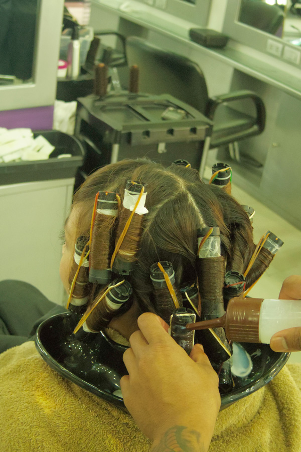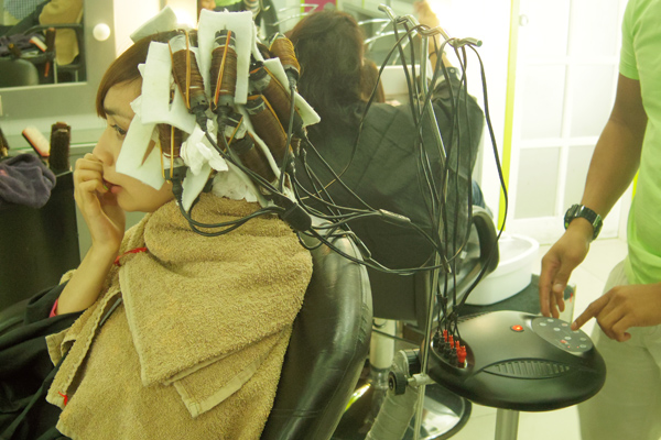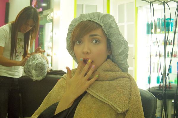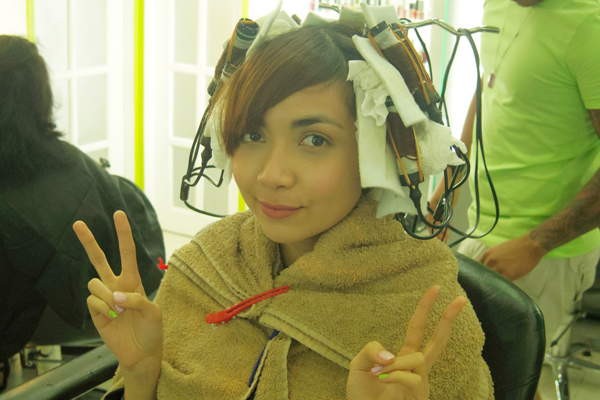 the process took place at BENEFITS SALON in eastwood, last sunday at noon (they really recommend everyone to reserve a day for this salon service). we started with the usual shampoo and combing to smoothen and soften hair out. a special cream was then applied to open up my hair strands’ pores (not sure if “pores” is really the correct term but that’s what the stylists used!), which was necessary for the strands to curl better with the heat. this was left on my hair for about 30 minutes and then washed off completely.