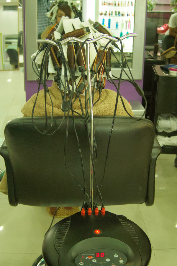 after all that, the rods were connected to the digital perming machine and my hair was “heated” for about 40 minutes. this was tricky because the smoke can be really uncomfortable (and sometimes burning on the scalp), plus all that weight on your head can be a total pain. so patience is key! anyway, when the wires were removed, my hair was drenched in a neutralizing liquid to close said “pores “and cool my hair for 30 minutes or so.