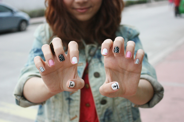 anyway i went for mismatched nails this time and just love how sweet/crazy it all is. i think i might do this more often now!