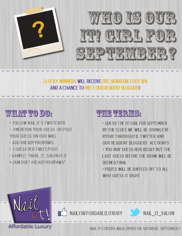 start by following nail it! on twitter and/or facebook — whichever is more convenient for you. watch out for clues on those accounts, as well as little tidbits from me, bea, jac, melai and tina. once you get an idea who the girl is, just tweet your answer or post it on their facebook wall. don’t forget to tag nail it! salon and include the hashtag #readyyourpaws. the contest will run until september 5!