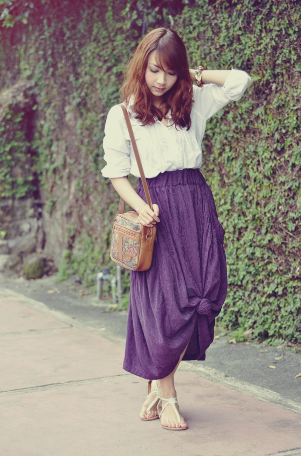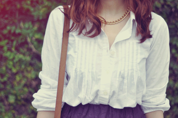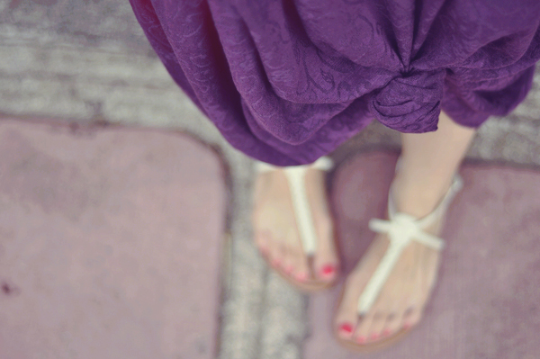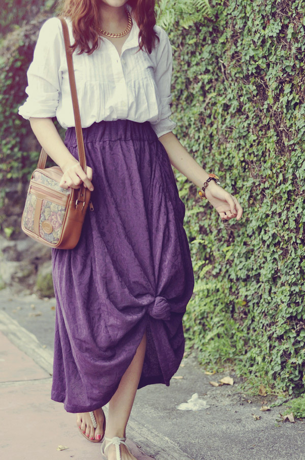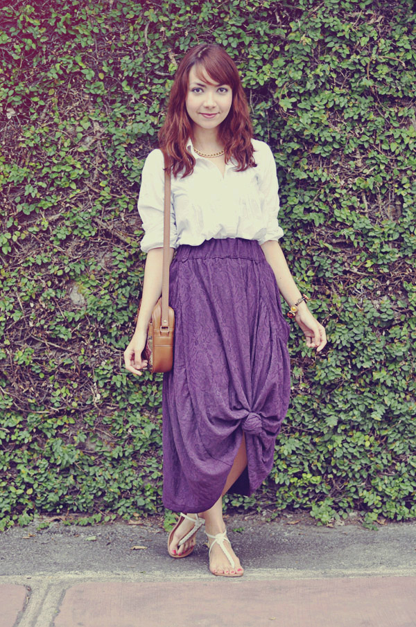anyway, i racked my brain thinking of other ways i could wear the items i chose for the challenge and ended up nearly pulling my hair out. seriously! luckily enough i remembered an old trick i’ve been seeing on style blogs since the days of yore: turning your clothes around! i tried it with this purple midi and it worked like a dream. i knotted the bottom hem for good measure, too! feels like a totally different skirt now.
