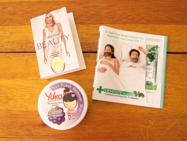 – gift cards for hair services redeemable at azta salon, free upper lip waxing at strip, shiseido product samples, and a l’occitane 10% discount voucher.
