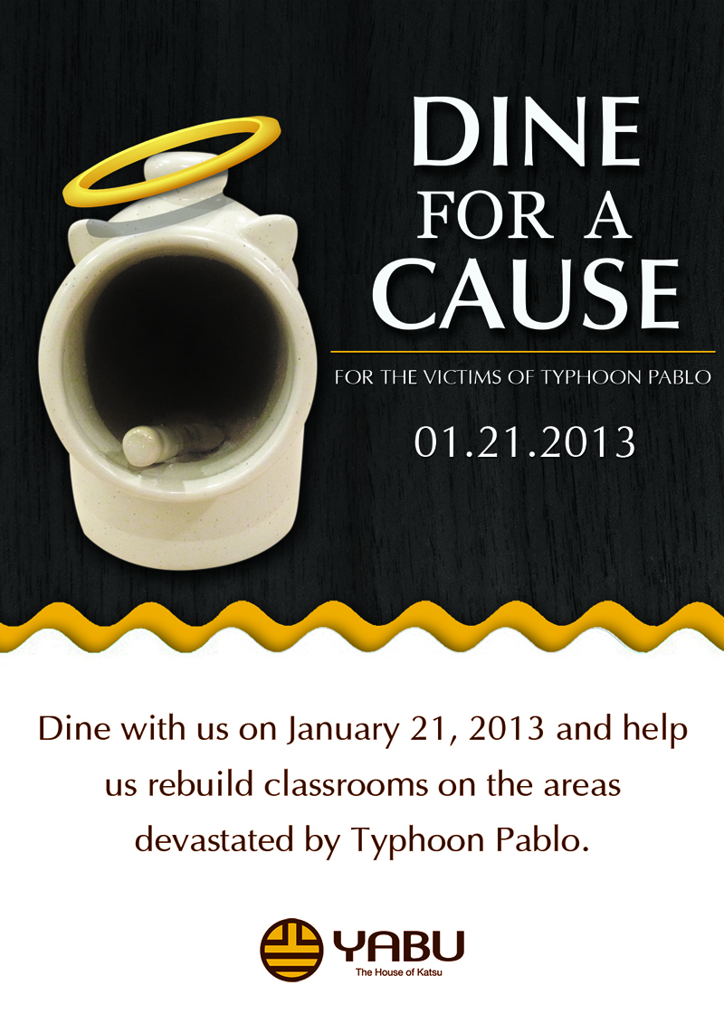 in light of the recent devastation caused by typhoon pablo, yabu house of katsu is re-launching the second leg of dine for a cause on january 21, 2013. yabu will donate a good share of their net profit of all 3 branches (megamall, mall of asia and robinsons magnolia) on the said date to help rebuild classrooms in the areas affected by the calamity. let us extend our hand to our fellow citizens who are now very much in need of our help.