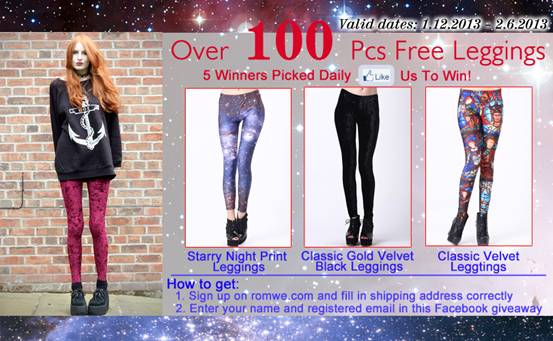 this month ROMWE is giving away over 100 pairs of leggings to its facebook fans. all you have to do is like the giveaway page and leave your name, plus your registered e-mail address on the romwe site! 5 winners will be picked daily!