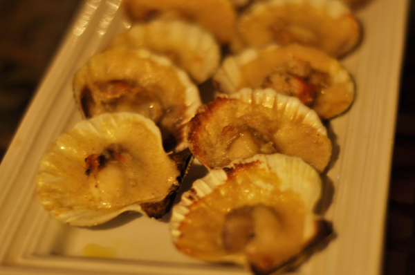 on the table: grilled tuna belly, sinigang na baby prawns, adobong kangkong, and baked scallops.