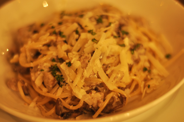 on the table: truffle cream pasta, [a really yummy salad, the name of which i can’t remember atm], mushroom & gruyere pizza, and pasta marinara.