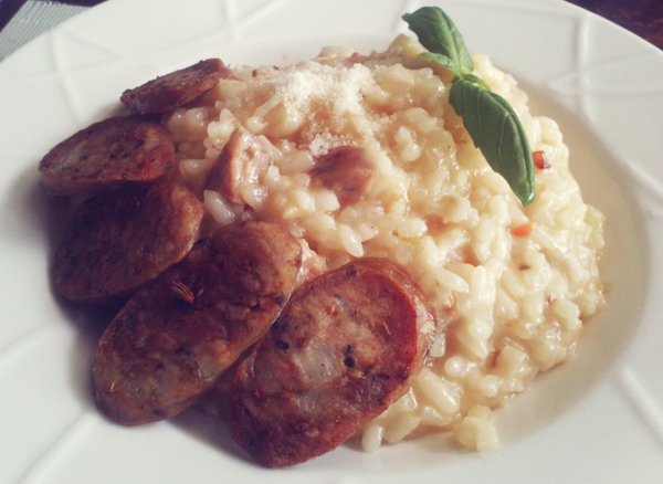 our spread: shrimp bisque, risotto con salsicce e cippole arrostite, new york pizza, and chicken parmigiana.