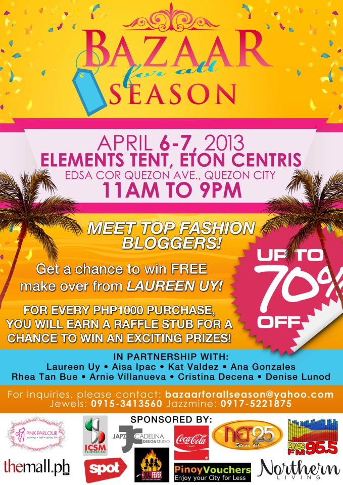 hey folks! see you all this weekend at the BAZAAR FOR ALL SEASON, at CENTRIS, QC, where i will be selling a bunch of my stuff — alongside some other fabulous bloggers and online sellers! it’s gonna be awesome!!! 😀