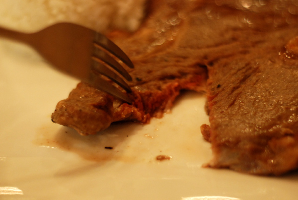 i dug into my steak — requested to be cooked in medium doneness, which is my favorite way to eat a steak — and was startled to find it to lean more toward rare than anything else. the whole thing looked a bit too daunting to even put in my mouth, especially with the huge slab of undercooked fat running around its edges. in the end the steak tasted “okay”, but after several mishaps with the fatty areas i just set them aside completely. the gravy tastes nice too but i prefer to eat steak with a wee sprinkle of salt & pepper, so i only had a handful bites slobbered in the sauce. overall i was dismayed at my dinner — plenty of which was rendered inedible because of the rubbery texture and sheer difficulty to chew.