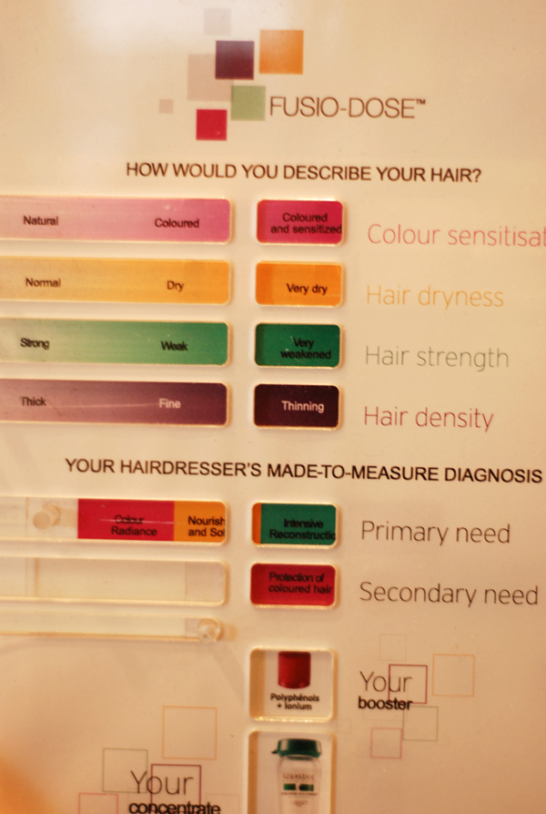 after a good rinse using l’oreal’s crème de la crème of shampoos and conditioners, it was time for my pampering. jimmy’s assistant trudis suggested i try a new-to-me treatment called fusio-dose. this breakthrough by kérastase is a made-to-measure deep conditioner completely customizable to suit one’s needs. i got a medley of liquid that targeted hair texture and provided shine plus color protection — exactly what i needed. the fusio-dose was sprayed from a bottle, massaged into my hair and left in cellophane for 15 minutes.