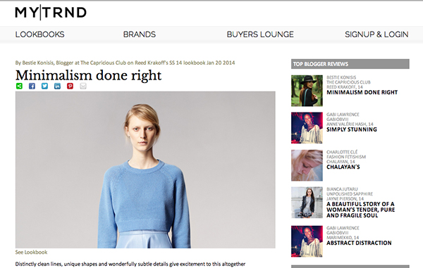 here is my final mini review on the MY|TRND website, this time talking about the resort 14 collection of luxury designer reed krakoff. i am not a minimalist dresser myself, but appreciate the aesthetic/lifestyle as a whole and truly wish one day i can learn to dress in a more edited way. this collection is certainly a great inspiration board to kick things off for me.