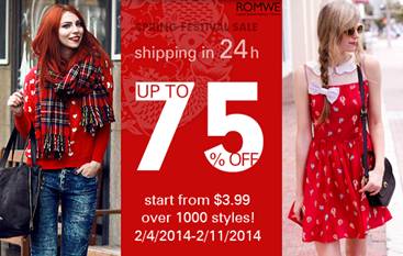 in celebration of the chinese spring festival, romwe will be offering some of their loveliest items at up to 75% off! shop starting tomorrow until feb. 11 and browse over 1,000 styles — with prices starting at $3.99. talk about an awesome deal!