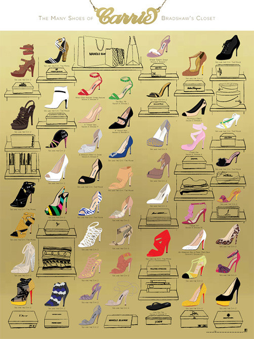 the lifestyle that i lead is far from that of carrie’s; i doubt i will ever amass even a small collection of designer goods, more so one to rival carrie’s [fictional] assemblage. however i have found the next best thing: this sweet metallic gold poster ($28) featuring hand-drawn illustrations of some 50 pairs of footwear featured on the show. from louboutins to YSLs and the many manolos in between, i can drool over ogle these iconic, sky-high kicks daily without breaking the bank.
