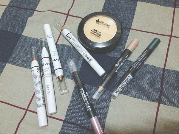 NYX jumbo eye pencils, jordana 12hr eyeshadow pencils, jordana forever flawless pressed powder