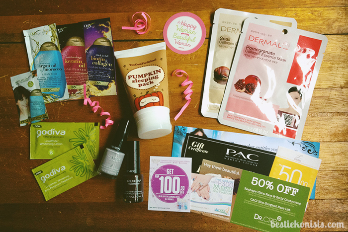 the goodies include (left to right, top to bottom): organix hair care set (P499/bottle) including moroccan and keratin variants, too cool for school pumpkin sleeping pack (P689), dermal face masks (P140) in pomegranate and snail collagen, godiva licowhite lotion (P120) and deodorant (P79), revlon colorstay nail polishes (P325) in french roast and provence, and a whole bunch of GCs & discount coupons from avon, i do nails, bifesta, lucido-l, dr. crb and PAC.
