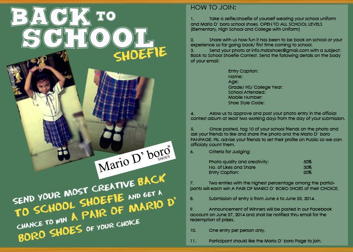 guess what you guys! one of my favorite local shoe brands, mario d’ boro, is holding a fun back-to-school photo contest! all you have to do to join is take a picture wearing your uniform AND your pair of mario d’ boro school shoes, have your friends like it on facebook, and the entries with the most number of likes will each win a pair of any MDb shoes of their choice! and trust me, the brand’s current selection of shoes is TO DIE FOR (so many cute boots and heels, eep!).