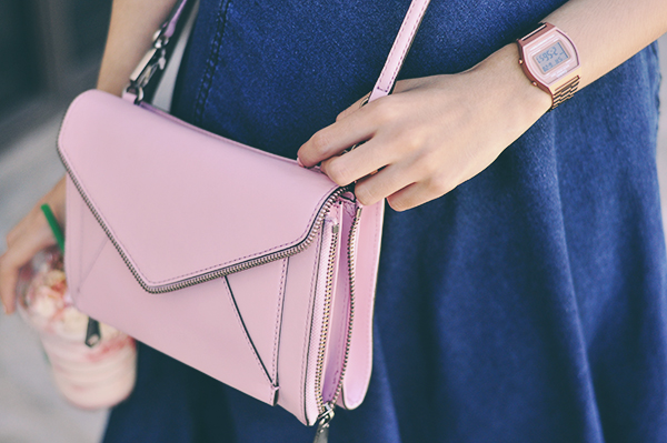 while i often find myself drawn to pretty pastel shades my closet is not exactly filled with soft hues of mint or peach or baby blue. in a way pastels are a bit trickier to wear than they are to look at; not every color would suit one’s style or skintone or, in my case, most clothing and accessories i own. still i like to buy and incorporate pastels on occasion: this pale, blush pink bag is a recent addition to my small rebecca minkoff handbag collection and i find it quite versatile (it can be used as a clutch!) for such a new-to-me color.
