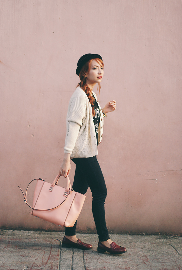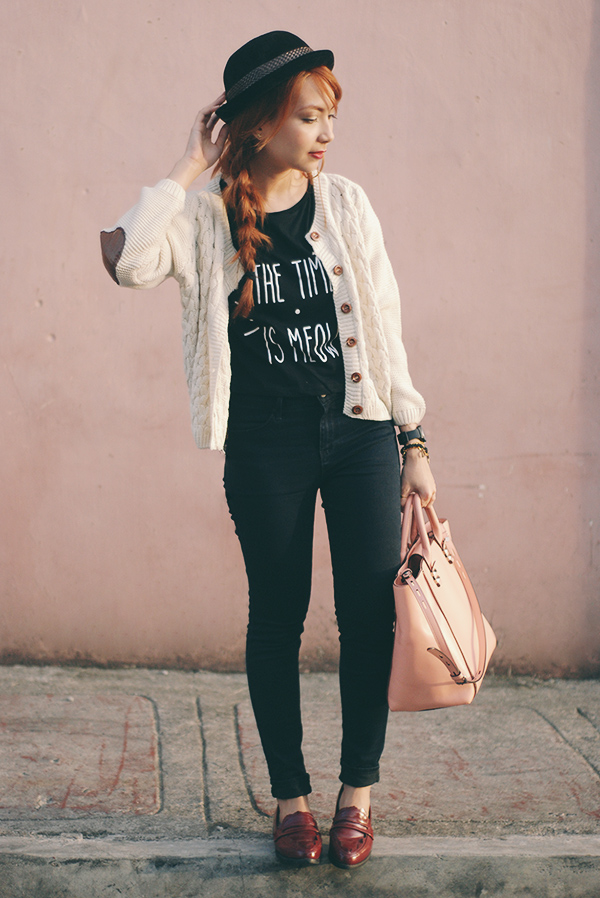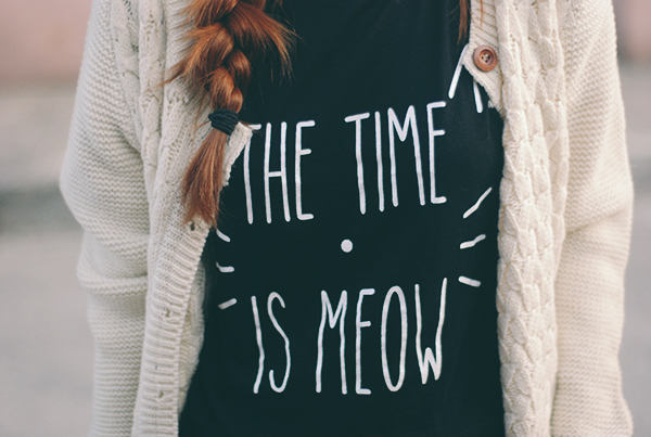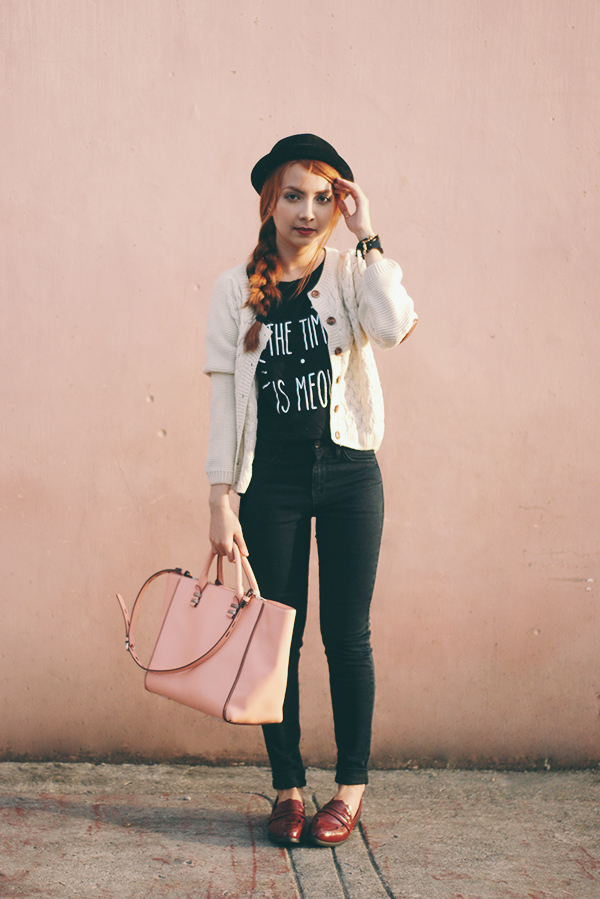 i can never resist cutesy shirts like this — throw in a cat theme and i’m a goner. here i paired it with some of my treasured, menswear pieces to give the outfit some contrast, but i am already eyeing a girlier look to wear it with. it’s too cute, no? i always giggle a bit when i see this shirt..