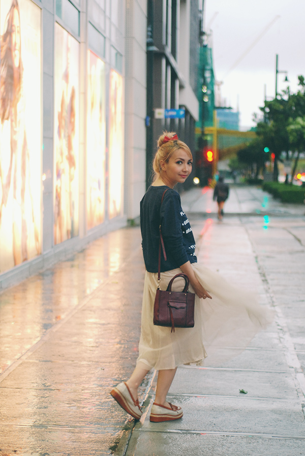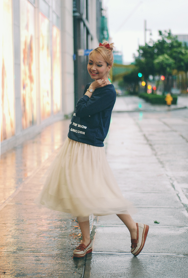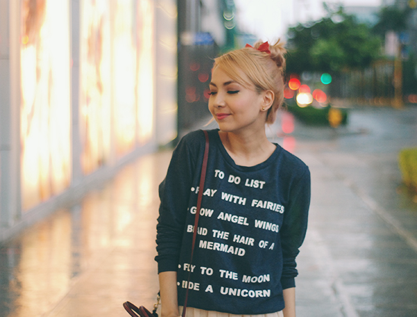 leave it to my boyfriend to convince me of doing an outfit shoot in the midst of a heavy downpour. don’t get me wrong; i’m not complaining. i actually quite liked my look that day, which comprised of this fantasy-themed sweatshirt and my good ol’ tutu midi. the top is darling and cozy, perfect for a girl like me who frequently has her head in the clouds..
