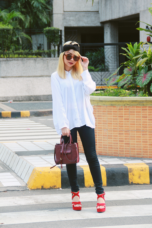 i was rummaging through my archives and found a couple of outfit photo sets, from several weeks ago, that i haven’t posted on the blog yet. that never really used to happen to me. the pictures i take are always immediately edited and posted here, but i suppose life has been getting in the way of all that. anyway i thought i’d upload these nonetheless, as it shows the kind of understated look that i have been wearing a lot too much these past few months. john sometimes comments that i never go out in “dressed up” looks anymore and always opt for casual skinny jeans, but i honestly can’t help it. when you find a pair (or two. or three.) that you love, that feels comfortable, that you can pair with absolutely everything…well, you end up favoring it over a lot of your other clothes. throw in an oversized shirt and some rockin’ sunnies and you’re good to go.