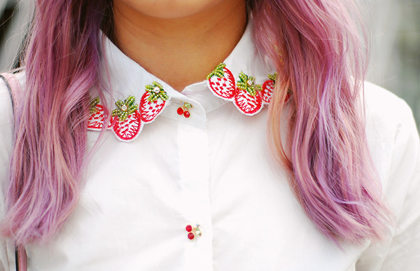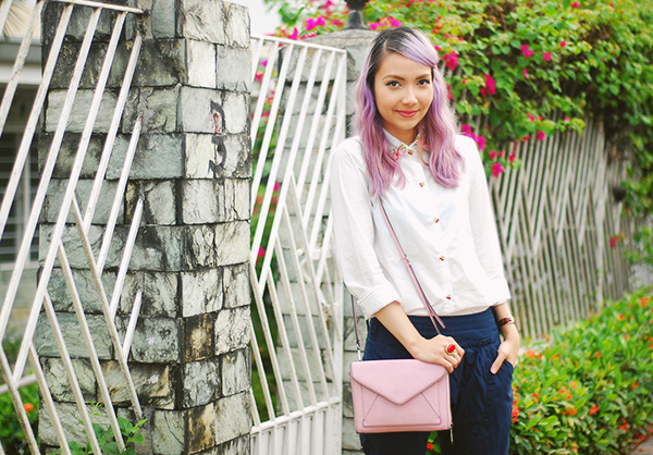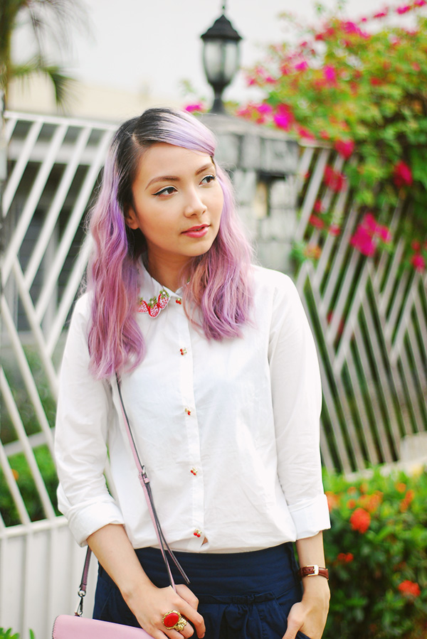 so i decided to go ‘old school’ with this look, just for the heck of it. i like to think of it as a throwback to my typical work uniform that i always enjoyed wearing (we even took these photos at my usual spot near my old office!). this time around i opted for a juvenile fun spring-y top with adorable cherry buttons and a strawberry collar because, you know, dressing grown-up never has to mean dressing boring. amirite or amirite?