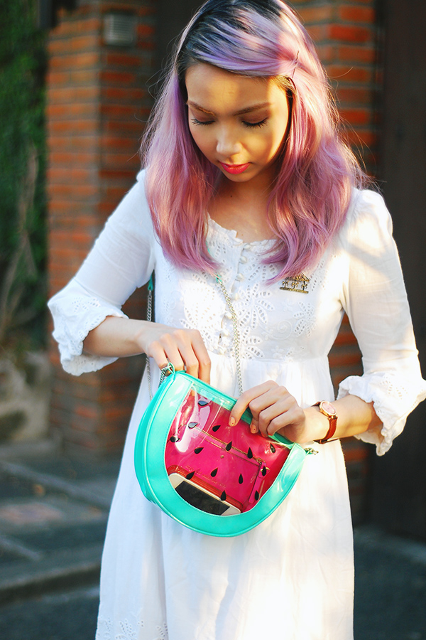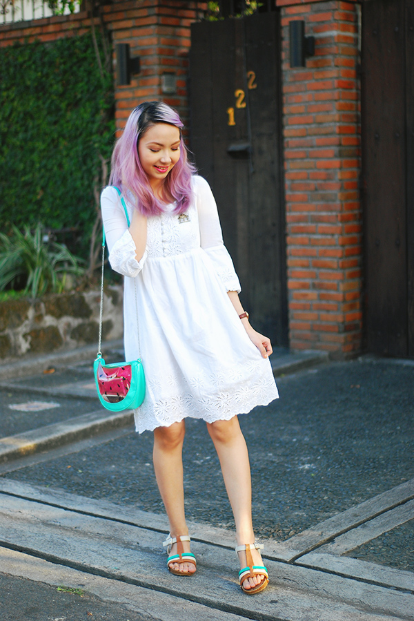 the arrival of summer always stresses me out for some reason, but i admit it’s been quite fun digging out all of my favorite warm weather pieces to wear around town. this little dress is a thrift find from long, long ago and i never get tired of it; easy, white dresses are such a staple for this time of year. throw in a fun watermelon bag and i almost forget i am melting in the heat…