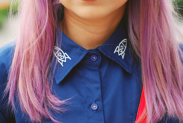 my fascination with all things outer space has been growing steadily over the years, so you can imagine my excitement over finding this cropped button-down not long ago. it was hanging in a thrift shop corner, seemingly unwanted and waiting quietly to be discovered. i am happy to have been the lucky buyer: the shirt, with its rocket-embroidered collar, is cute and well-fitting — indeed a perfect addition to both my wardrobe and outer space collection.