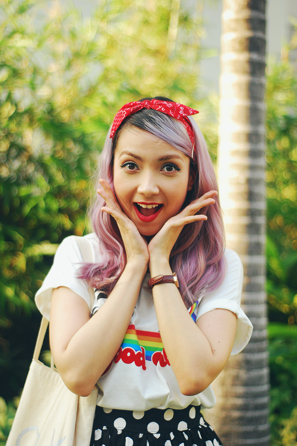 i am finally getting around to posting these pictures, which were taken weeks ago before the MYOH 2015 event. it’s not just my usual bout of laziness that led to this much delay: this set of photos is the last i have with my purple hair, which made me procrastinate posting quite a bit. if you’ve been following my [newly instated] weekly vlogs, or was present at bloggers united 9, you would have already seen my new dark hair. while i am extremely happy with my current look, seeing these photos with the pastel tresses kills me a little inside!