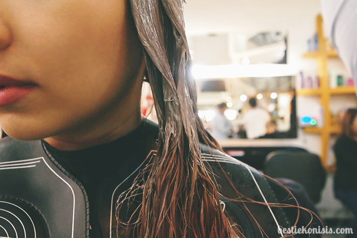 the rest of my hair was covered in a dark, ash-toned hair dye (i didn’t have a preference; i just told them to make my hair look pretty!) and left to develop for a few minutes.