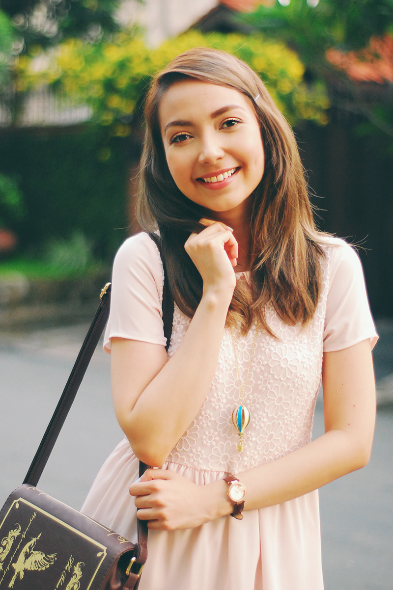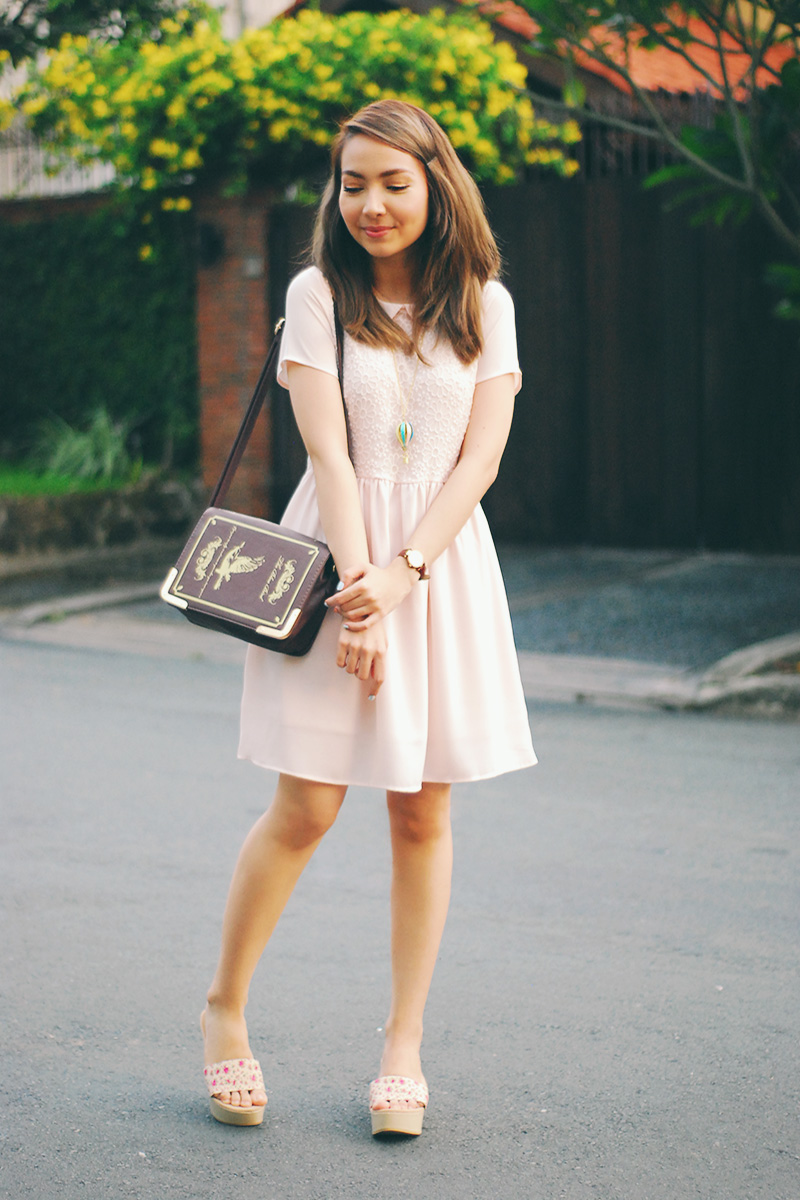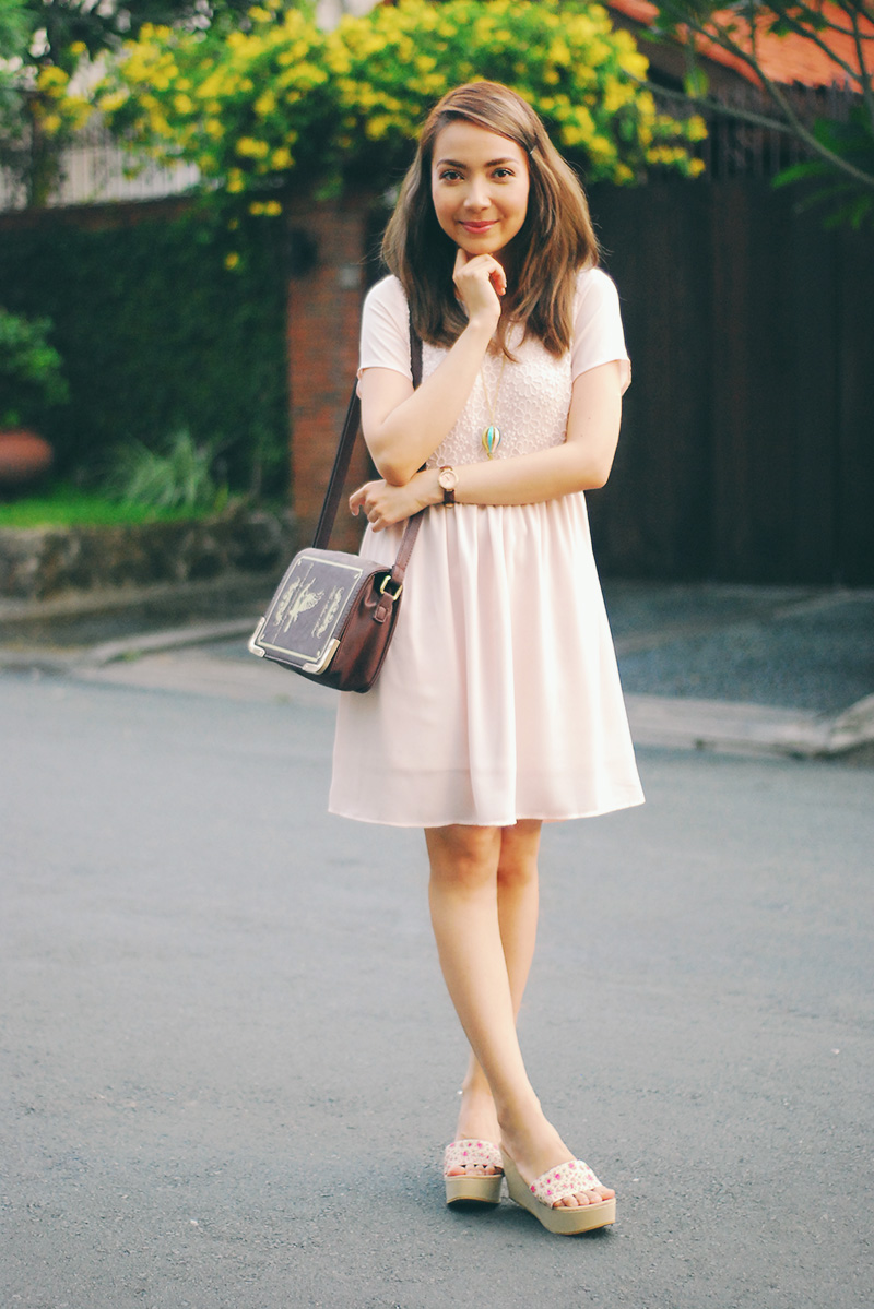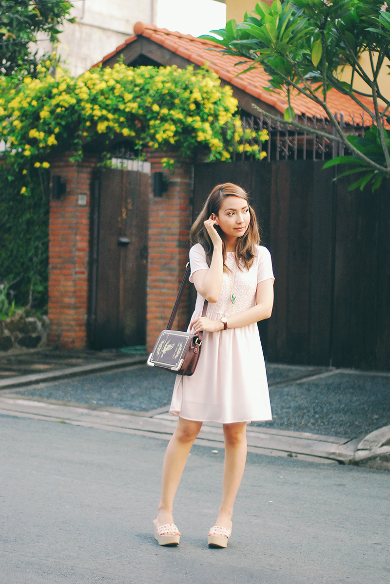 dressing pragmatically has been my thing lately (lots of casual tees, jeans, and worn-in sandals that seriously need replacing), which partly explains the lack of outfit posts on here. if you watch my vlogs you know i frequently accompany john to his errands and meet-ups for his business, so i don’t bother getting dolled up too much knowing i’ll be running all over the place. the day that i wore this outfit though, i SO wanted to dress up. i pulled out a few of my girliest dresses and picked this pink one, then paired it with floral wedges and my new pastel necklace that i am obsessed with. admittedly my dress kept flopping around with the wind and my feet hurt after hours of constant walking, but i felt such joy in my ensemble that none of it mattered in the end..