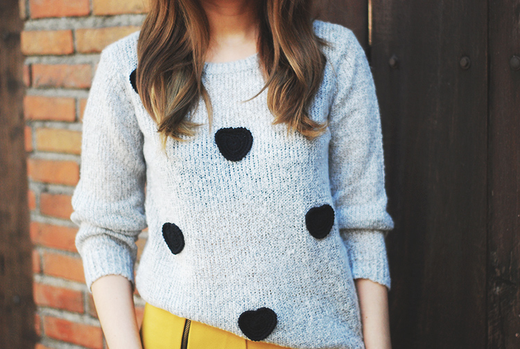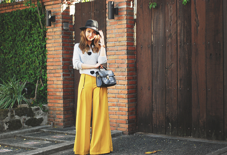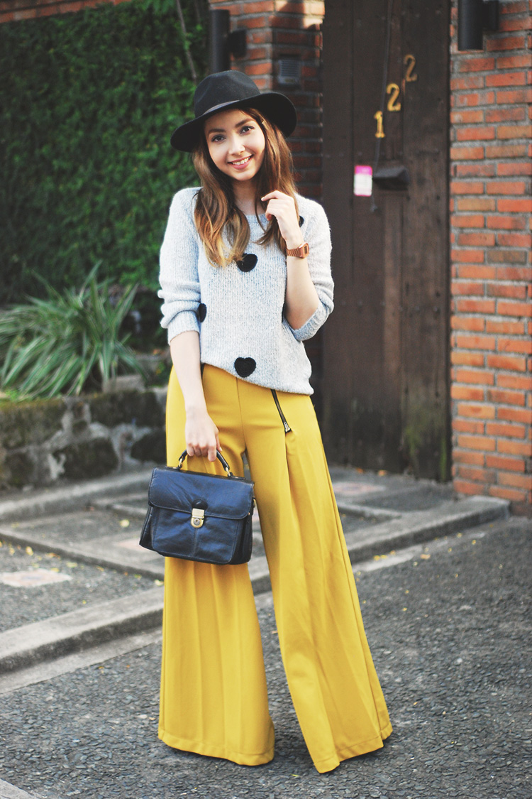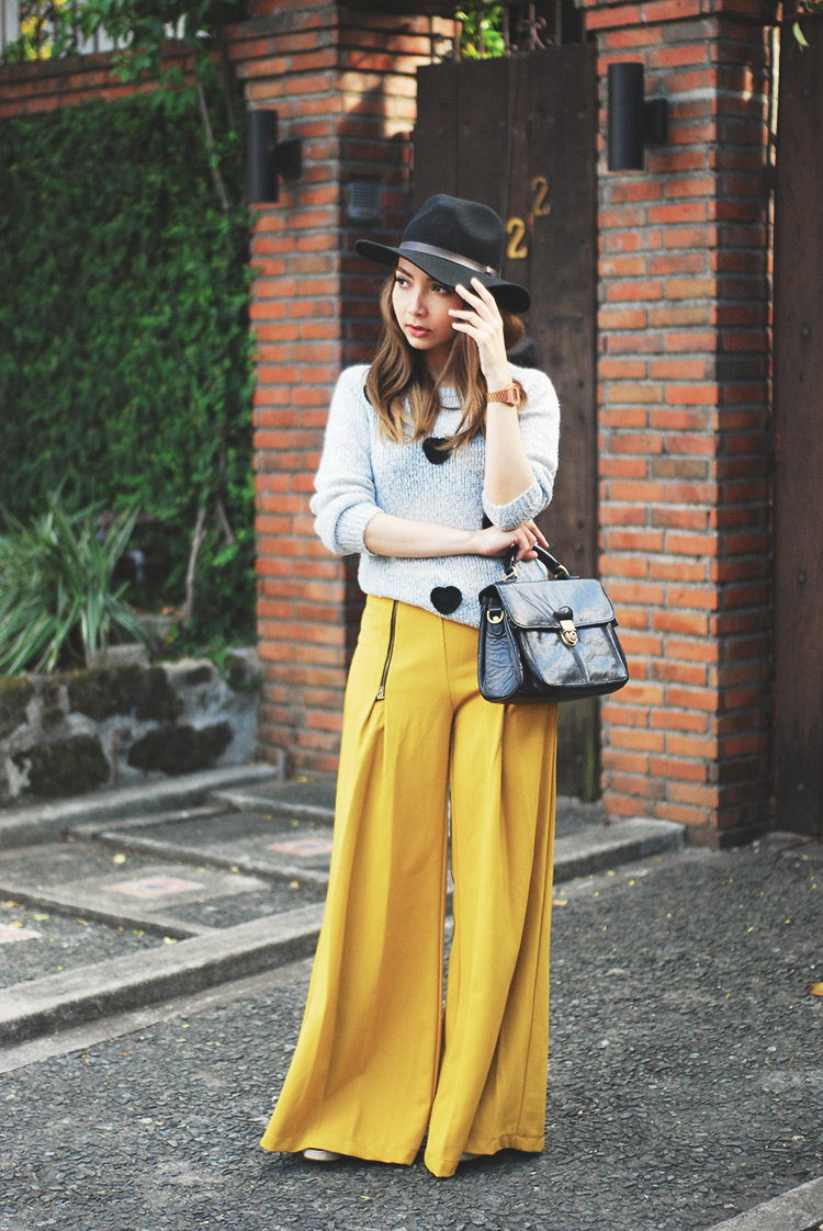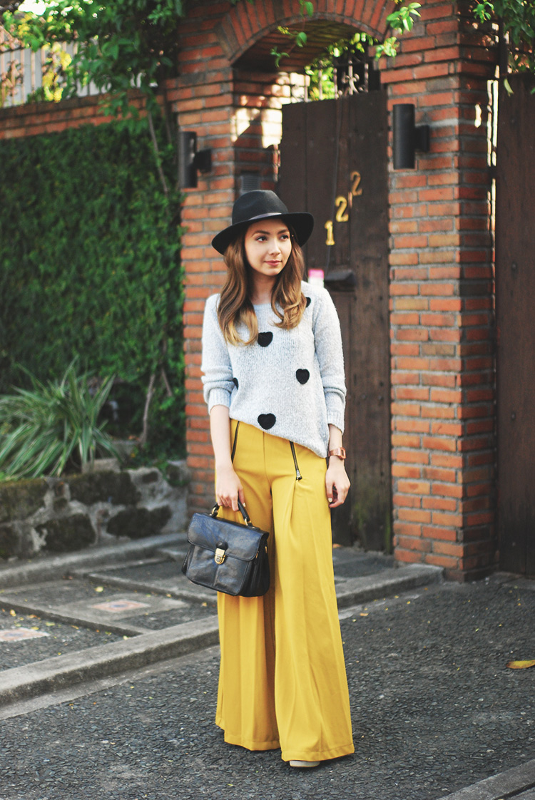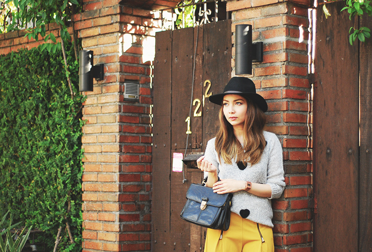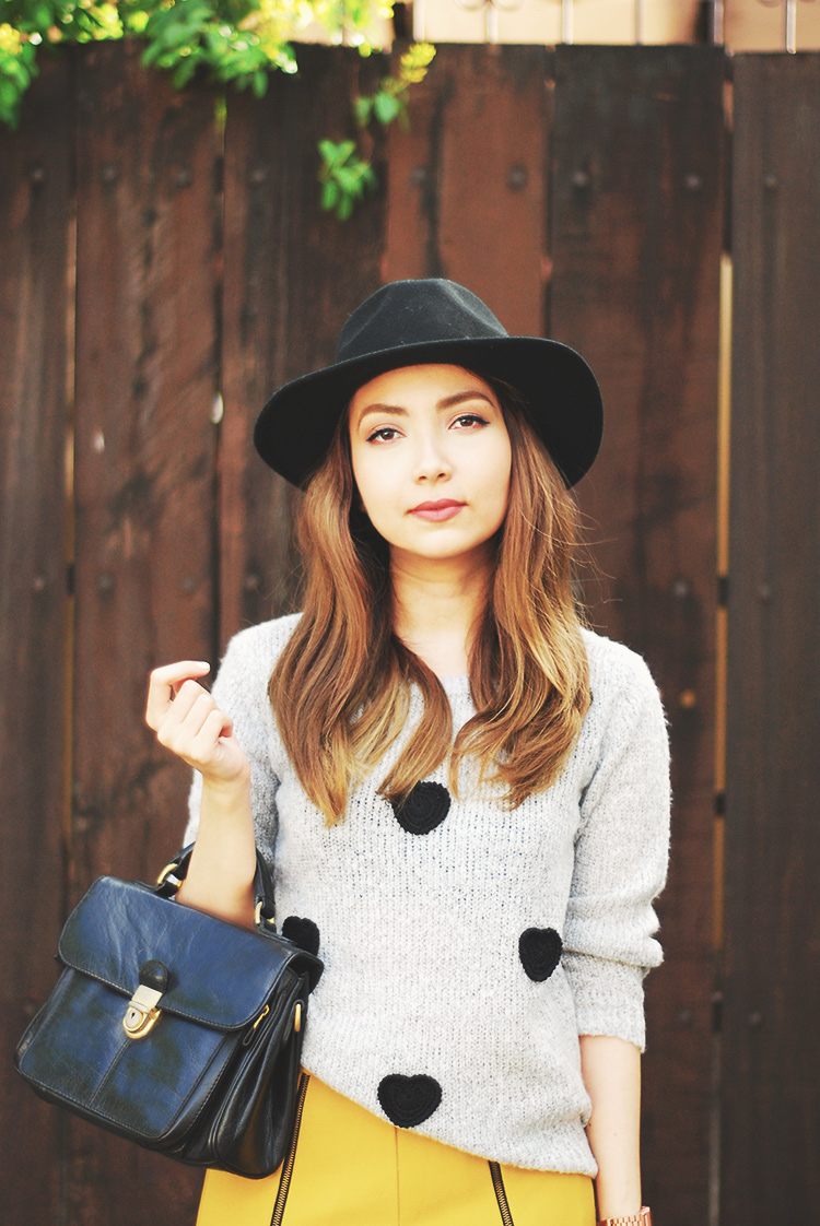 dorothy perkins heart sweater | old trousers | vintage bag | wide-brimmed fedora