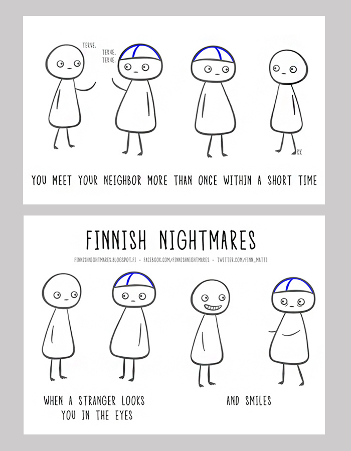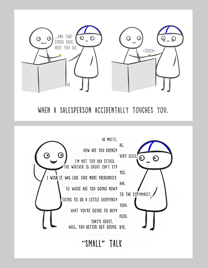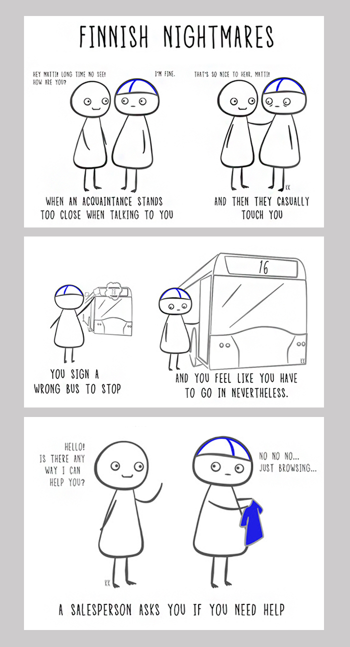in this hilarious series of mini situational comics, finnish illustrator karoliina korhonen demonstrates what she describes as ‘the most awkward social situations a stereotypical Finn can encounter.’ it features the adorably awkward matti, who wears an interesting hat and values his personal space very much. while the depictions talk about finnish behavior as a whole, pretty much every introvert, germophobe, and socially awkward individual will be able to relate to one — or all — of them. a lot of these certainly resonate with me (fyi, i am the worst at small talk) and i am officially addicted!