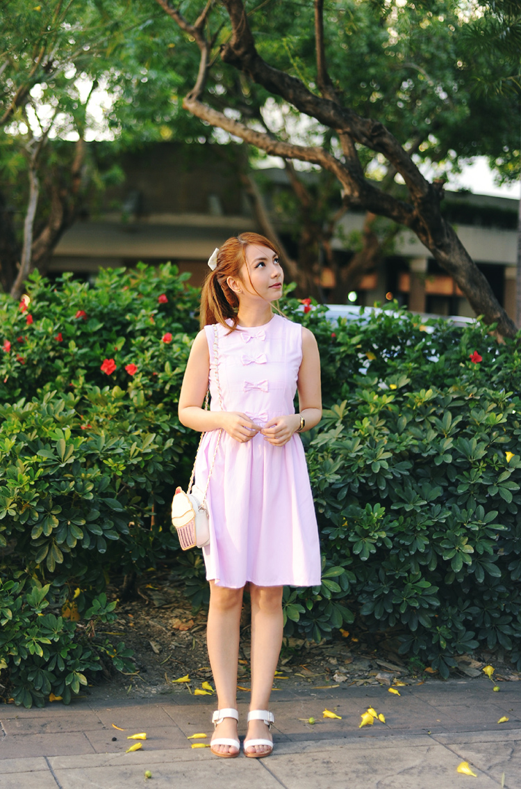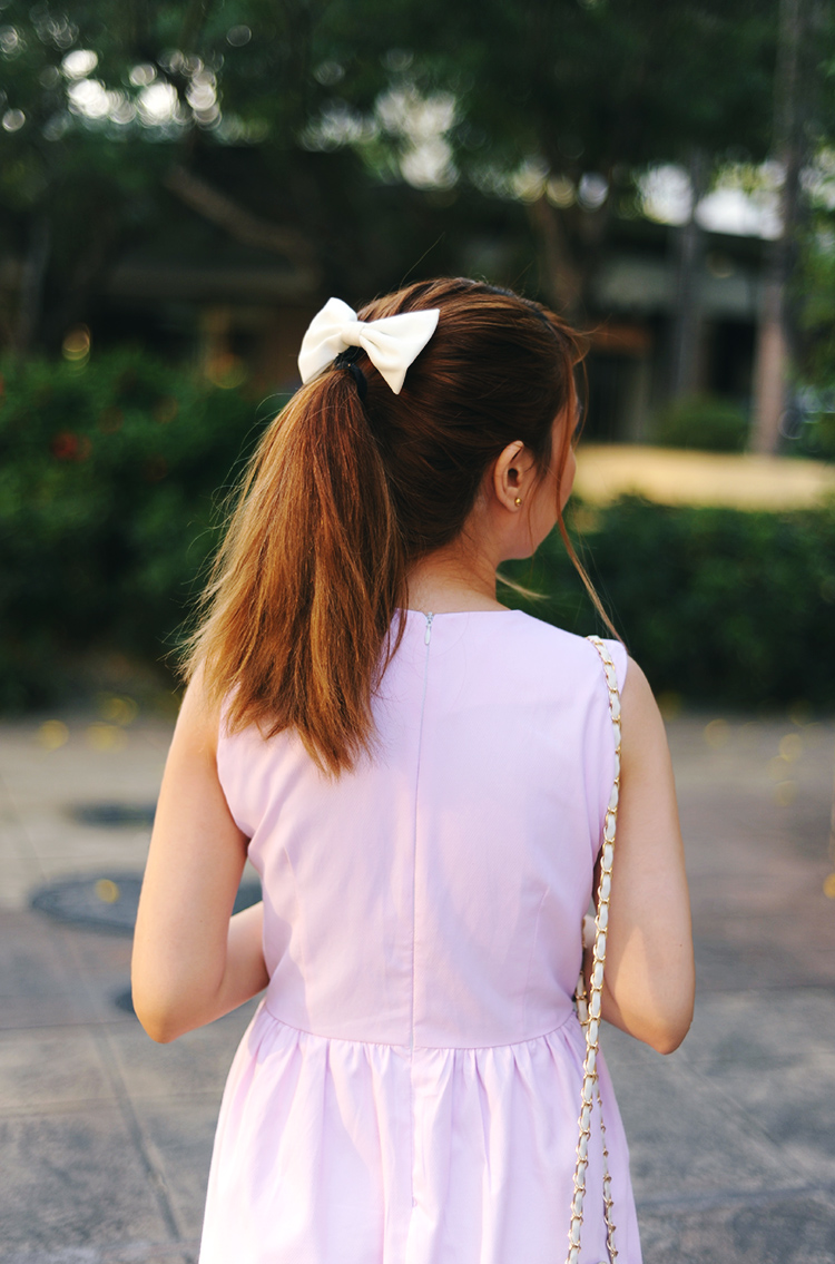 i feel like i go through phases of liking pink as a color. there was a time in my young life when i disliked even being associated with it (i loved sailor mars as a kid so red remained my favorite color for a few years), but in my adolescence i learned to love the sweet, soft hue. nowadays i am not particularly partial to it; however, its pastel likeness is one that i can never seem to resist. in fact, this dress style i am wearing in this particular kind of pink was one the first designs i finalized for le caprice — a dress that i lovingly named after one of the most recognized style icons of the last century, and one that always brings a smile to my face.