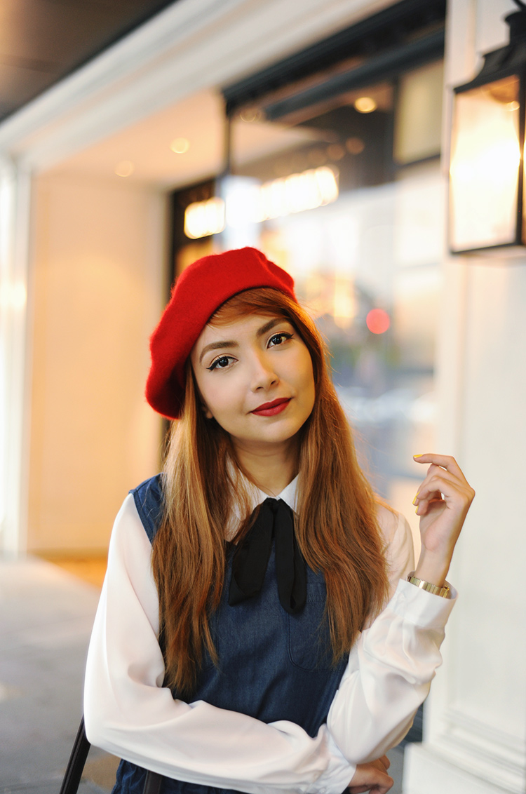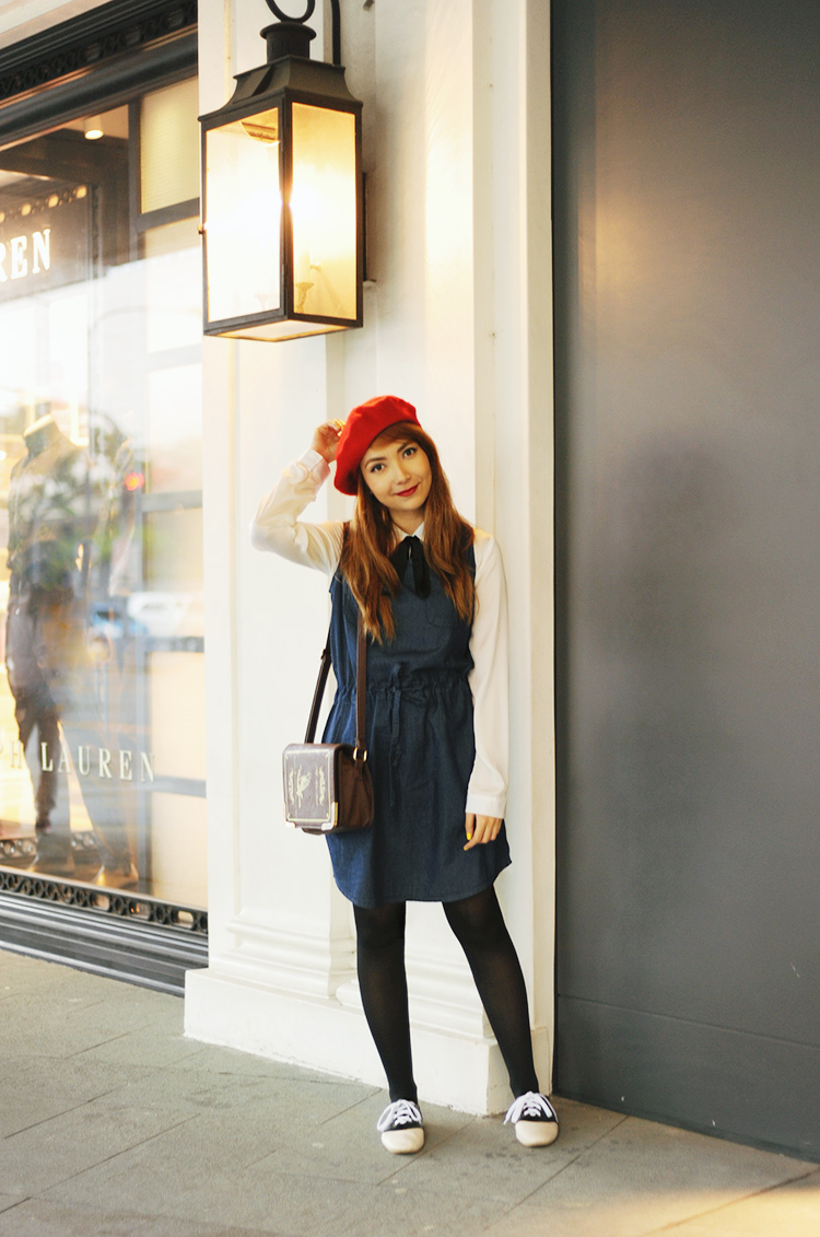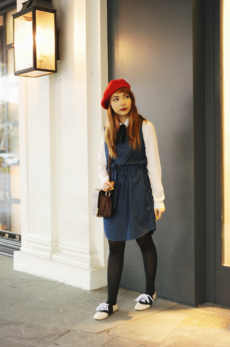 outfit details: SM woman shirt and chambray dress | saddle shoes | red beret | book bag