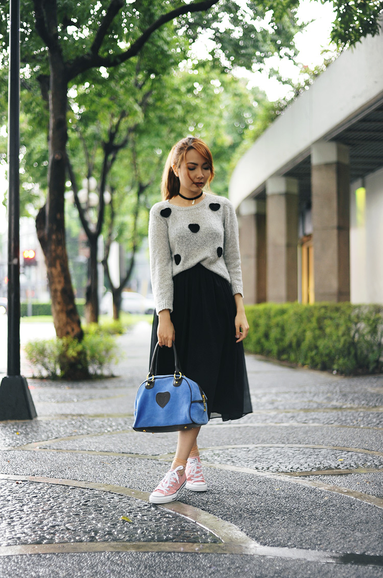 outfit details: dorothy perkins sweater | bb dakota midi skirt | converse chuck taylors |