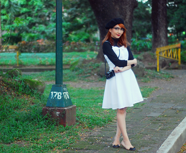 i decided to do two versions of this outfit of a white dress + black inner top, as i thought the combination went both ways rather easily. the first is a modern, street style look with white sneakers and mirrored sunglasses, the second a sort of french-librarian-retro-chic medley that fits more into my usual style (though i would wear both outfits either way).