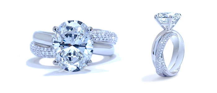 this particular style is ideal for those who like maximum bling in their ring. there is one center stone, usually a diamond, and the band is completely covered in pavé set diamonds. where this one can be tricky is that you need to size it properly from the start. the diamond encrusted band makes it almost impossible to have it sized at a later date. if you tend to go up and down in ring sizes, this may not be the best option.