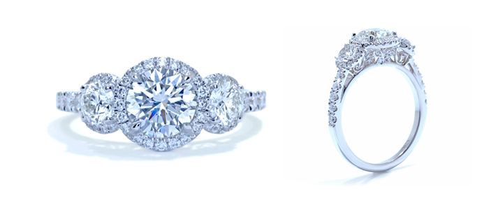 this setting has become more and more popular of late, especially with trendy modern brides. you’ll find this is also a very popular setting with celebrities. by definition this setting features a center stone (the diamond or gemstone), which is then surrounded with round pavé diamonds. sometimes the ring gives the illusion that it’s just one big stone. people like the fact that even when you pick a smaller center stone, it will appear larger thanks to the halo effect. this is a great option for those on a budget who still want to make a statement.