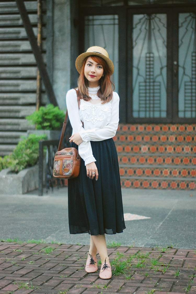 outfit details: thrifted top (similar) | bb dakota skirt | oxfords shoes | vintage bag