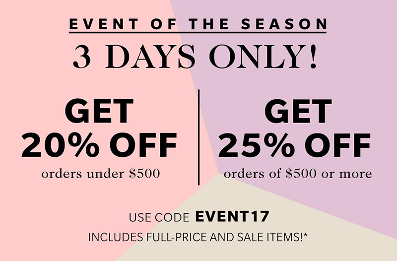 just enter the code EVENT17 at checkout to get 20% off orders under $500 and 25% off orders $500 and up. i’ve already snatched up a few things and i am SO excited to get them. be sure you don’t get left out of this one guys!