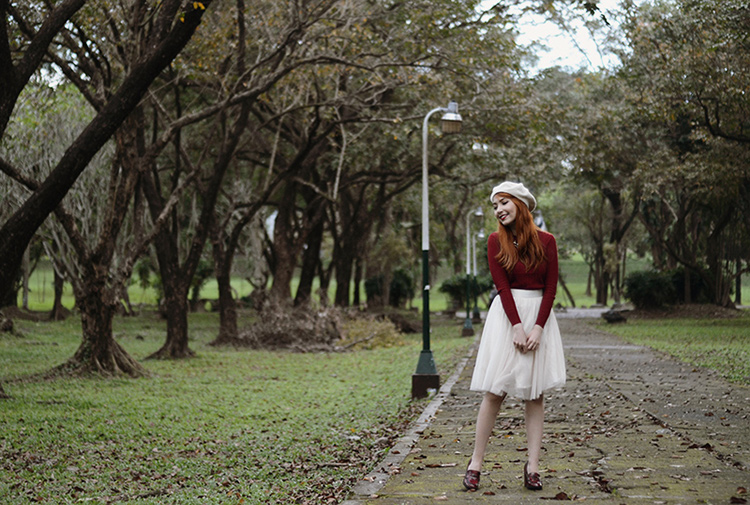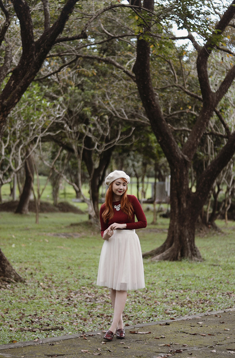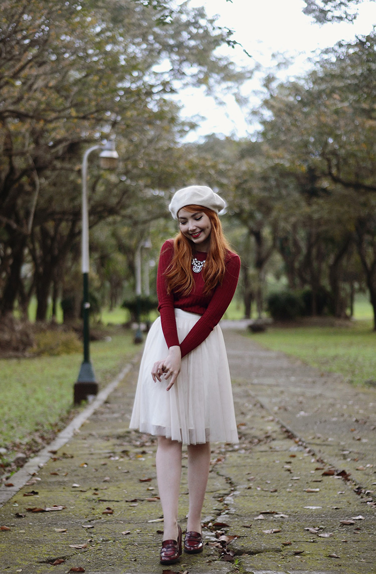 outfit details: red sweater | tutu skirt | loafer heels | cream beret | happiness boutique necklace