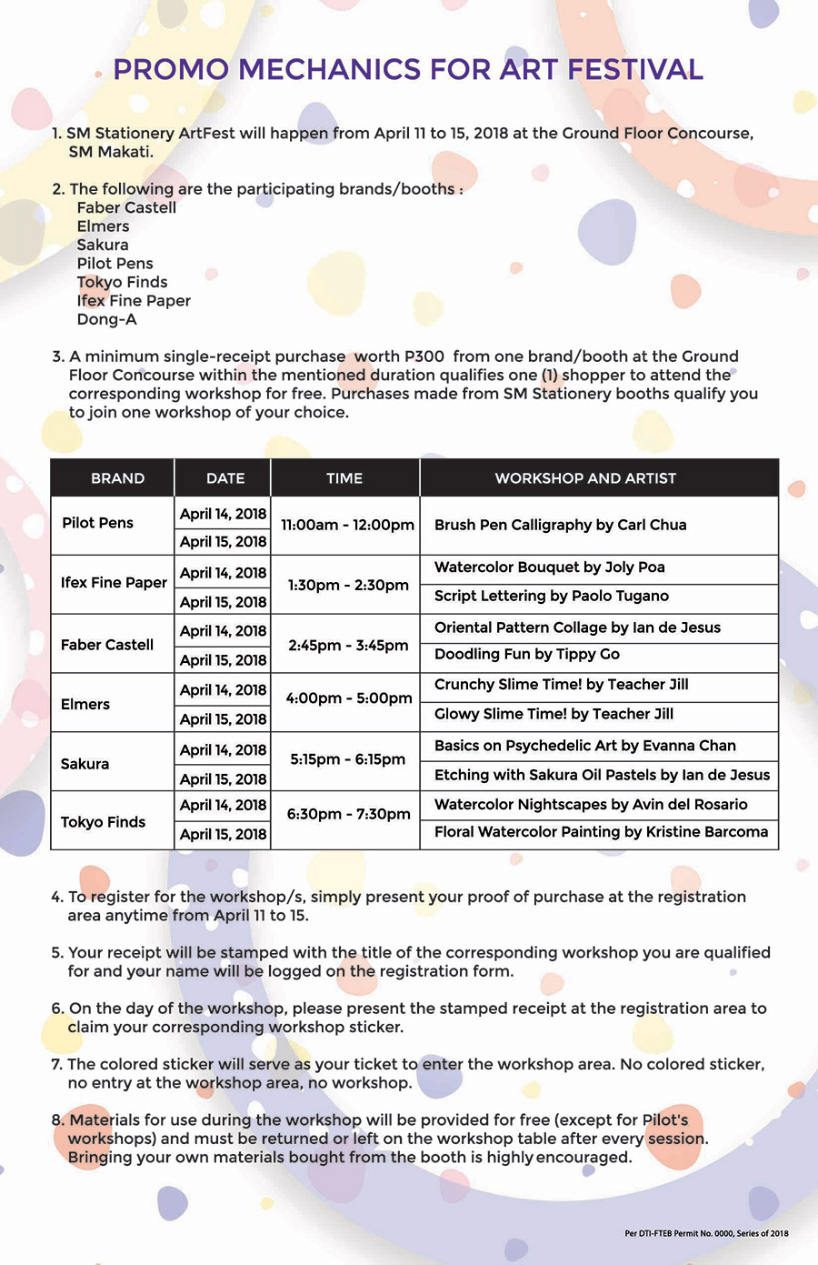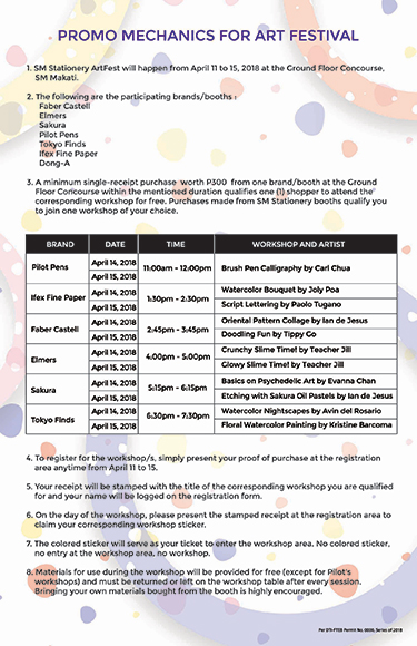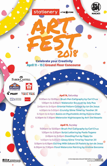 see anything that tickles your fancy? you, too, can learn a fun new skill from some of the country’s finest artists! from today until sunday, april 15, 2018, all you have to do is make a minimum single-receipt purchase worth P300 from any of SM stationery’s participating brands located at the ground floor concourse, SM makati.